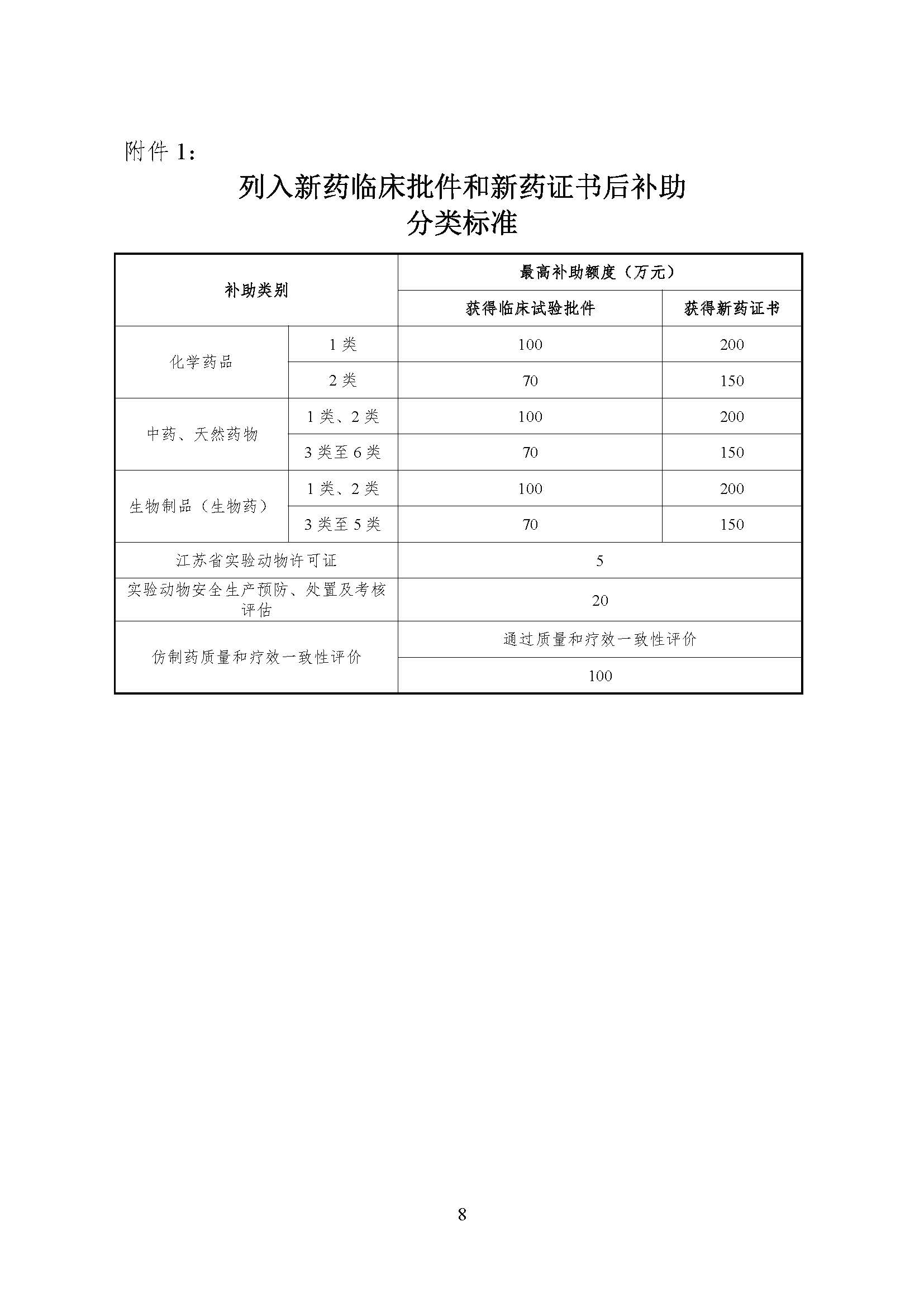 1. 1类至2类化学药新药,根据各阶段成果给予补助。其中,1类化学药新药,获得临床试验批件,给予不超过100万元额度补助;获得新药证书,给予不超过200万元额度补助;2类化学药新药,获得临床试验批件,给予不超过70万元额度补助;获得新药证书,给予不超过150万元额度补助。